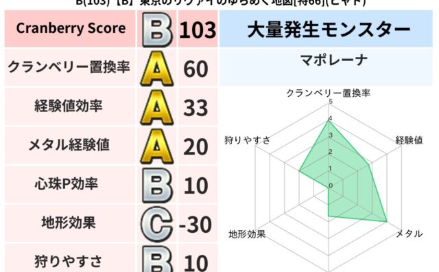 クランベリーボット判定結果の詳細クランベリースコア:92クランベリー置換率:69%大量発生モンスター:マポレーナメラ超耐性(80%)こころ道 完全一致モンスターさまようよろいゴッドハンド(守護道Lv5)かっちゅうアリ魔人(共通Lv1)マポレ...