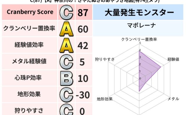 クランベリーボット判定結果の詳細クランベリースコア:122クランベリー置換率:62%大量発生モンスター:マポレーナデイン超耐性(51%)超耐性・弱耐性なし:ドルマこころ道 完全一致モンスターキメラ大魔導士(共通Lv1)ストーンマンゴッドハン...