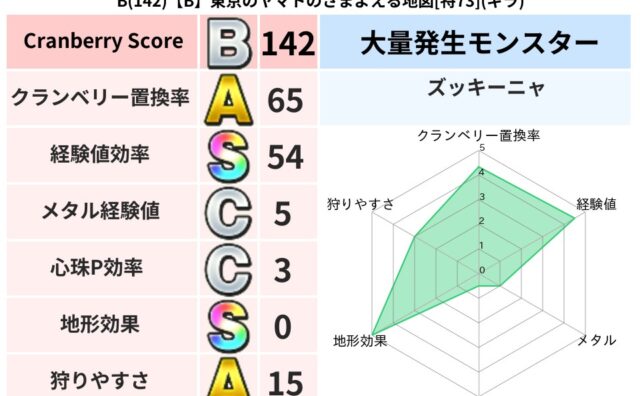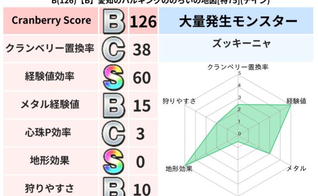 地図判定結果 B(126)【B】愛知のハルキングののろいの地図[特75](デイン) クランベリーボット判定結果の詳細クランベリースコア126クランベリー置換率38%大量発生モンスターズッキーニャ超耐性デイン(0%)こころ道 完全一致モンスターしのどれいゴッドハンド(守護道Lv5)大魔道士(魔力道Lv5)スカルガルードラゴン... 2025/10/12 20:24 地図判定結果