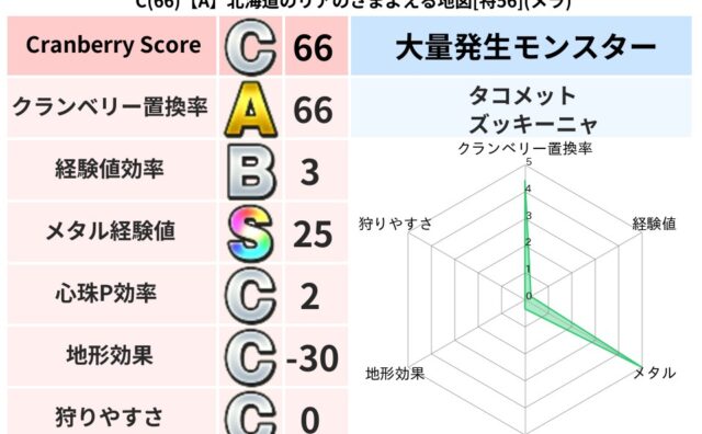 地図判定結果 C(69)【A】神奈川のマアののろいの地図[特66](バギ) クランベリーボット判定結果の詳細クランベリースコア:69クランベリー置換率:60%大量発生モンスター:メトロゴースト,ズッキーニャバギ超耐性(46%)こころ道 完全一致モンスターかっちゅうアリ魔人(共通Lv1)メトロゴースト大魔導士(理力道... 2025/09/16 12:10 地図判定結果