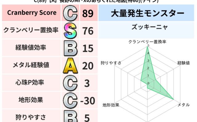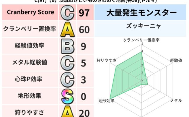 クランベリーボット判定結果の詳細クランベリースコア:97クランベリー置換率:60%大量発生モンスター:ズッキーニャドルマ超耐性(0%)こころ道 完全一致モンスターフロストギズモ魔剣士(魔道Lv5)りゅうき兵天地雷鳴士(地道Lv10)ズッキー...
