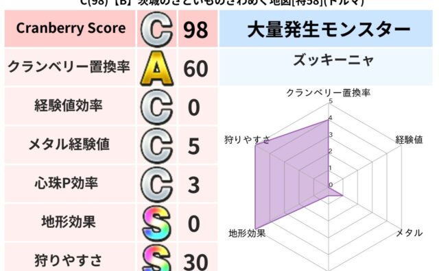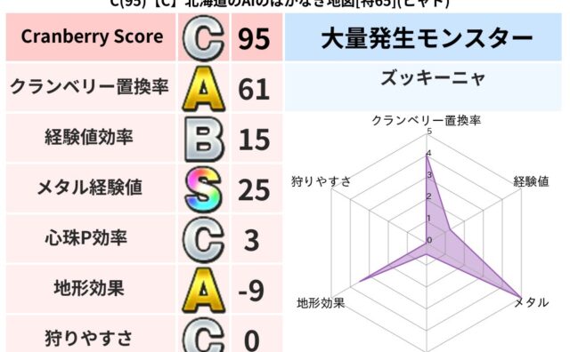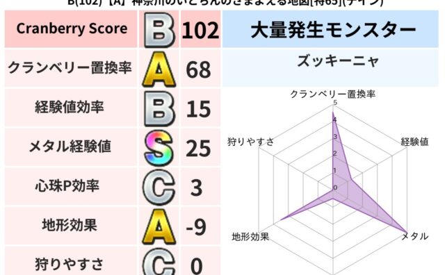 クランベリーボット判定結果の詳細クランベリースコア89クランベリー置換率76%大量発生モンスターズッキーニャ超耐性デイン(37%)こころ道 完全一致モンスターみならいあくまニンジャ(風道Lv5)デビルアーマー大神官(舞道Lv5)イエティ魔剣...