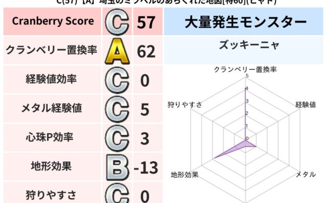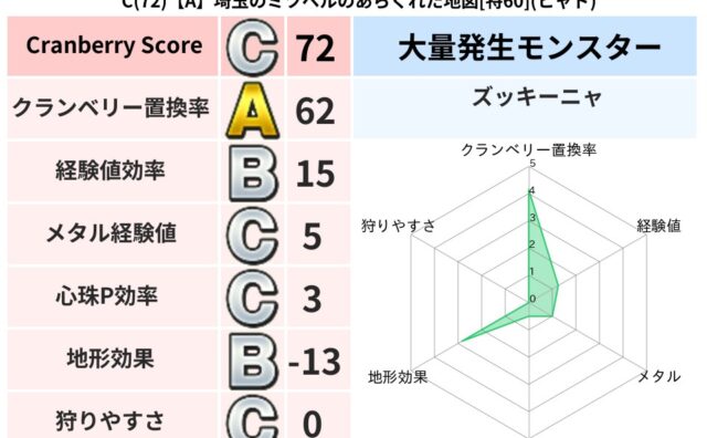 クランベリーボット判定結果の詳細クランベリースコア:133クランベリー置換率:61%大量発生モンスター:ズッキーニャドルマ超耐性(0%)こころ道 完全一致モンスターおおさそり: ゴッドハンド(武道Lv5),ドラゴン(共通Lv1)キャタピラー...