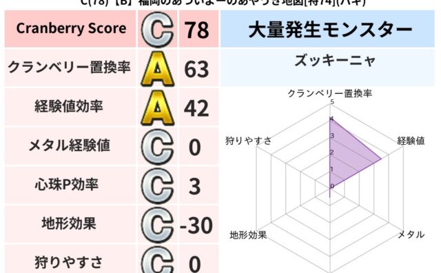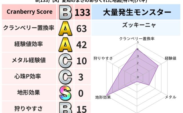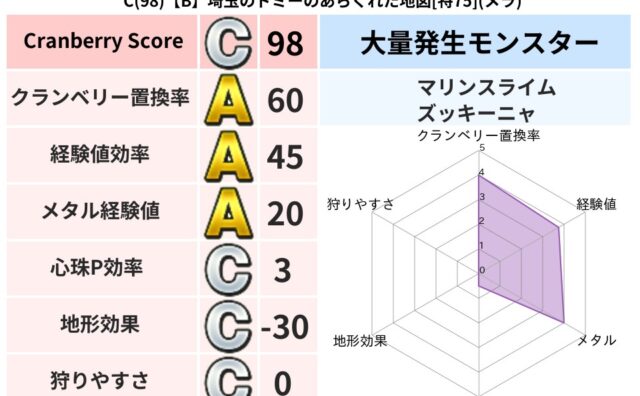 クランベリーボット判定結果の詳細クランベリースコア98クランベリー置換率60%大量発生モンスターマリンスライム,ズッキーニャ超耐性メラ(58%)こころ道 完全一致モンスターシャドーニンジャ(波道Lv30)かっちゅうアリ魔人(共通Lv1)りゅ...