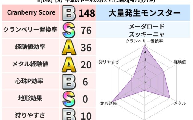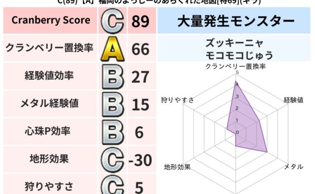 クランベリーボット判定結果の詳細クランベリースコア:104クランベリー置換率:66%大量発生モンスター:ズッキーニャ,モコモコじゅうギラ超耐性(76%)超耐性・弱耐性なし:ドルマこころ道 完全一致モンスターナイトキャット守り人(まもり道Lv...