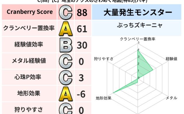地図判定結果 C(88)【C】埼玉のアクスのざわめく地図[特65](バギ) クランベリーボット判定結果の詳細クランベリースコア:88クランベリー置換率:61%大量発生モンスター:ぶっちズキーニャバギ超耐性(5%)こころ道 完全一致モンスターくさった死体ゴッドハンド(守護道Lv5),大魔導士(魔力道Lv5)ドロヌーバ... 2024/08/18 19:47 地図判定結果