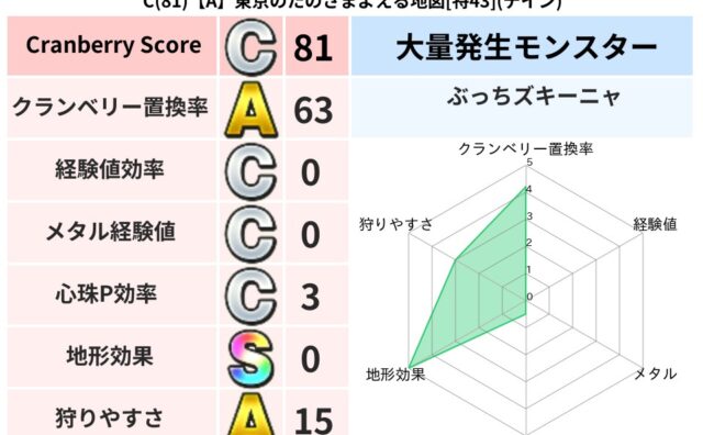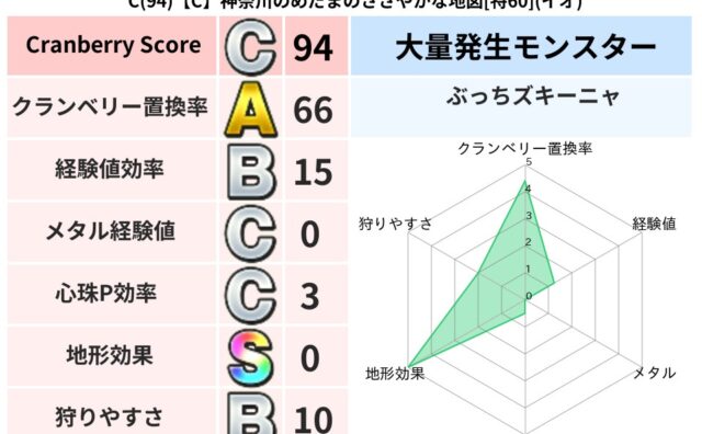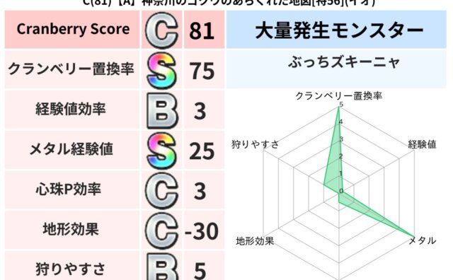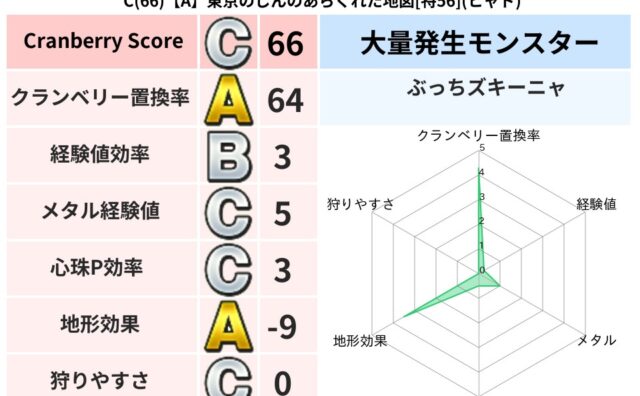 地図判定結果 C(91)【A】東京のたのさまよえる地図[特43](デイン) クランベリーボット判定結果の詳細クランベリースコア:91クランベリー置換率:63%大量発生モンスター:ぶっちズキーニャデイン超耐性(0%)こころ道 完全一致モンスターアイアンクック: 守り人(まもり道Lv5)どくイモムシ: ニンジャ(波道L... 2024/03/05 09:01 地図判定結果