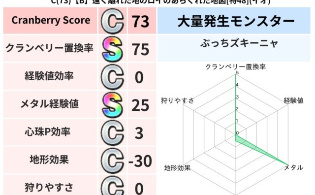 地図判定結果 C(94)【C】神奈川のめだまのささやかな地図[特60](イオ) クランベリーボット判定結果の詳細クランベリースコア:94クランベリー置換率:66%大量発生モンスター:ぶっちズキーニャイオ超耐性(0%)こころ道 完全一致モンスターてつのさそりゴッドハンド(守護道Lv5),大魔導士(魔力道Lv5)ストーンマ... 2024/03/02 16:51 地図判定結果