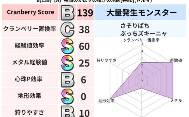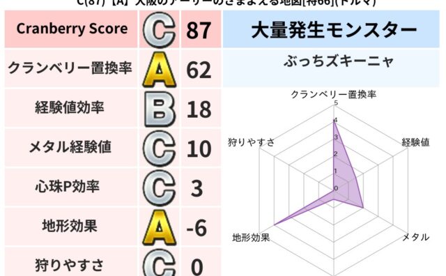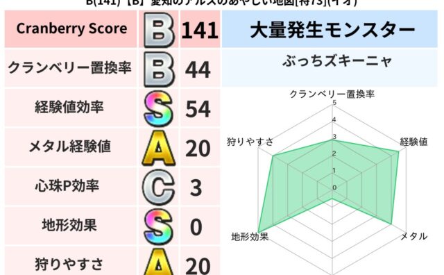 クランベリーボット判定結果の詳細クランベリースコア139クランベリー置換率38%大量発生モンスターさそりばち,ぶっちズキーニャ超耐性ドルマ(0%)こころ道 完全一致モンスターばくだん岩大神官(舞道Lv5)リカントマムルドラゴン(竜道Lv5)...