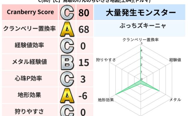 地図判定結果 C(80)【C】鳥取のけんのちいさき地図[上64](ドルマ) クランベリーボット判定結果の詳細クランベリースコア:80クランベリー置換率:68%大量発生モンスター:ぶっちズキーニャドルマ超耐性(5%)こころ道 完全一致モンスターベロニャーゴ大魔導士(理力道Lv5)アイアンクック守り人(まもり道Lv5)... 2025/07/02 21:40 地図判定結果