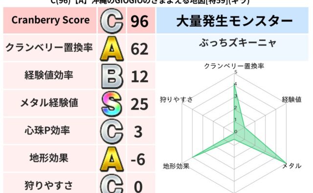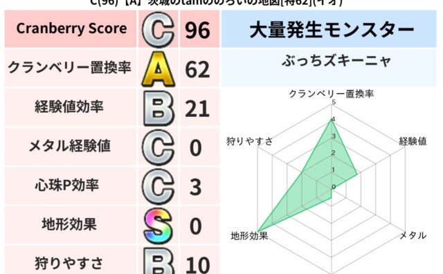 地図判定結果 C(96)【A】茨城のtamののろいの地図[特62](イオ) クランベリーボット判定結果の詳細クランベリースコア:96クランベリー置換率:62%大量発生モンスター:ぶっちズキーニャイオ超耐性(0%)こころ道 完全一致モンスターねこまどうニンジャ(風道Lv5)グリゴンダンス魔人(超魔道Lv5)たてまじん... 2025/06/22 10:24 地図判定結果