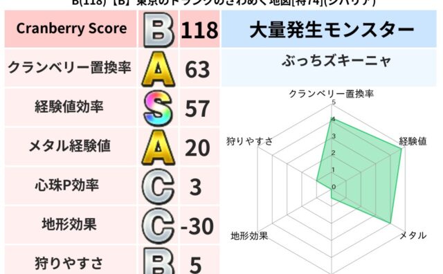地図判定結果 B(118)【B】東京のドランクのざわめく地図[特74](ジバリア) クランベリーボット判定結果の詳細クランベリースコア:118クランベリー置換率:63%大量発生モンスター:ぶっちズキーニャジバリア超耐性(46%)超耐性・弱耐性なし:ドルマこころ道 完全一致モンスターフレイム守り人(ささえ道Lv5)ストーンマ... 2025/09/02 16:47 地図判定結果