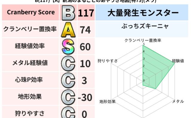 地図判定結果 B(117)【A】新潟のまるごとのあやうき地図[特75](メラ) クランベリーボット判定結果の詳細クランベリースコア:117クランベリー置換率:74%大量発生モンスター:ぶっちズキーニャメラ超耐性(52%)こころ道 完全一致モンスターアイアンクック守り人(まもり道Lv5)どくイモムシニンジャ(波道Lv5)... 2025/05/25 09:56 地図判定結果