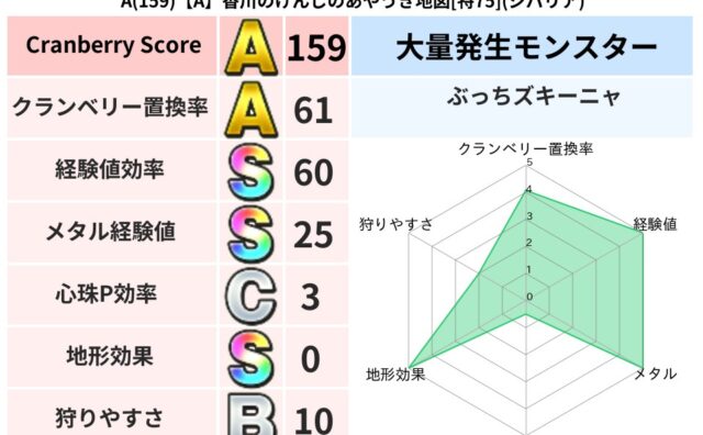 スコアA A(159)【A】香川のけんじのあやうき地図[特75](ジバリア) クランベリーボット判定結果の詳細クランベリースコア159クランベリー置換率61%大量発生モンスターぶっちズキーニャ超耐性ジバリア(0%)こころ道 完全一致モンスターストーンマンゴッドハンド(守護道Lv5)だいまどうゴッドハンド(武道Lv40... 2025/05/09 12:48 スコアA地図判定結果