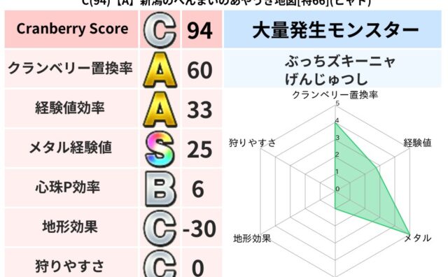 地図判定結果 C(94)【A】新潟のへんまいのあやうき地図[特66](ヒャド) クランベリーボット判定結果の詳細クランベリースコア:94クランベリー置換率:60%大量発生モンスター:ぶっちズキーニャ,げんじゅつしヒャド超耐性(79%)こころ道 完全一致モンスターどれいへいしドラゴン(人道Lv5)ベビーサラマンダ大神官(... 2025/05/27 00:45 地図判定結果