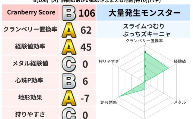 地図判定結果 B(106)【A】静岡のあかいぬのさまよえる地図[特70](バギ) クランベリーボット判定結果の詳細クランベリースコア:106クランベリー置換率:62%大量発生モンスター:スライムつむり,ぶっちズキーニャバギ超耐性(6%)こころ道 完全一致モンスターどくどくゾンビ魔剣士(共通Lv1)パペットマン天地雷鳴士(... 2025/05/09 23:22 地図判定結果