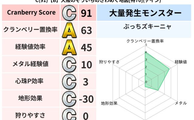 地図判定結果 C(91)【B】大阪のそういちのざわめく地図[特70](デイン) クランベリーボット判定結果の詳細クランベリースコア:91クランベリー置換率:63%大量発生モンスター:ぶっちズキーニャデイン超耐性(38%)こころ道 完全一致モンスターさまようよろいゴッドハンド(守護道Lv5)デビルアーマー大神官(舞道Lv... 2025/04/19 18:48 地図判定結果