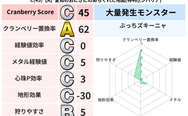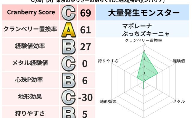 地図判定結果 C(45)【A】愛知のおにぎにのあらくれた地図[特46](ジバリア) クランベリーボット判定結果の詳細クランベリースコア:45クランベリー置換率:62%大量発生モンスター:ぶっちズキーニャジバリア超耐性(72%)超耐性・弱耐性なし:ヒャドこころ道 完全一致モンスターねこまどうニンジャ(風道Lv5)おおさそりゴ... 2025/03/23 19:23 地図判定結果