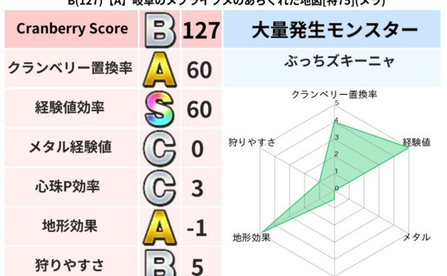 地図判定結果 B(127)【A】岐阜のメプライツメのあらくれた地図[特75](メラ) クランベリーボット判定結果の詳細クランベリースコア:127クランベリー置換率:60%大量発生モンスター:ぶっちズキーニャメラ超耐性(0%)超耐性・弱耐性なし:ドルマこころ道 完全一致モンスターねこまどうニンジャ(風道Lv5)どくイモムシニン... 2025/04/21 22:55 地図判定結果