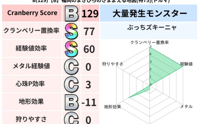 地図判定結果 B(132)【A】埼玉のゆきのあらくれた地図[特70](バギ) クランベリーボット判定結果の詳細クランベリースコア:132クランベリー置換率:44%大量発生モンスター:ぶっちズキーニャバギ超耐性(0%)超耐性・弱耐性なし:イオこころ道 完全一致モンスターしのどれい: ゴッドハンド(守護道Lv5),大魔導... 2025/03/27 21:46 地図判定結果