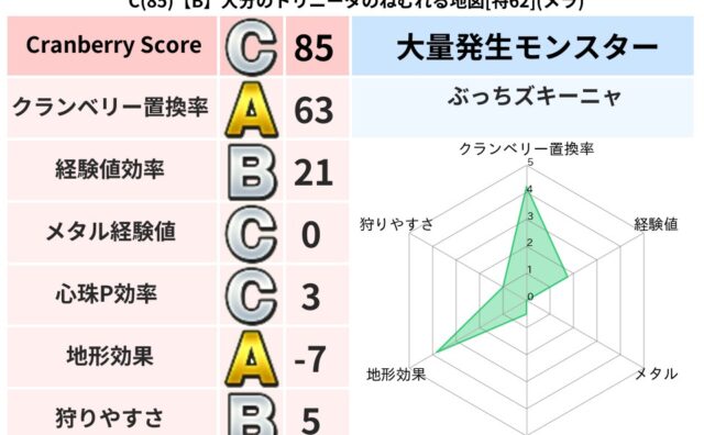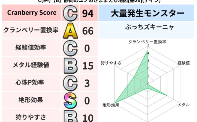 地図判定結果 C(94)【B】静岡のユノのさまよえる地図[基26](デイン) クランベリーボット判定結果の詳細クランベリースコア:94クランベリー置換率:66%大量発生モンスター:ぶっちズキーニャデイン超耐性(0%)こころ道 完全一致モンスターどくろあらいゴッドハンド(守護道Lv5)パペットマン天地雷鳴士(天道Lv5... 2025/02/13 19:41 地図判定結果