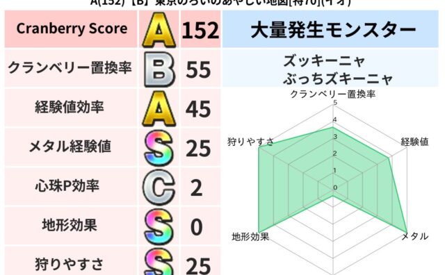 スコアA A(152)【B】東京のろいのあやしい地図[特70](イオ) クランベリーボット判定結果の詳細クランベリースコア152クランベリー置換率55%大量発生モンスターズッキーニャ,ぶっちズキーニャ超耐性イオ(0%)超耐性・弱耐性なしヒャドこころ道 完全一致モンスターストーンマンゴッドハンド(守護道Lv5)ジ... 2025/02/14 13:26 スコアA地図判定結果