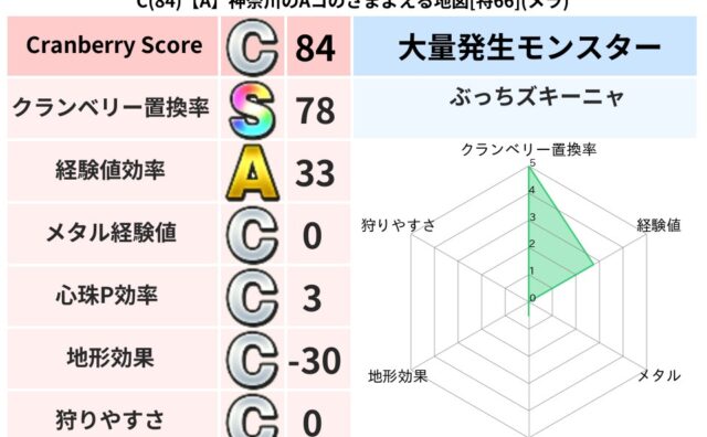 地図判定結果 C(84)【A】神奈川のAコのさまよえる地図[特66](メラ) クランベリーボット判定結果の詳細クランベリースコア84クランベリー置換率78%大量発生モンスターぶっちズキーニャ超耐性メラ(36%)こころ道 完全一致モンスターブラウニー守り人(共通Lv1)どれいへいしドラゴン(人道Lv5)かっちゅうアリ魔... 2024/12/14 19:36 地図判定結果置換率S