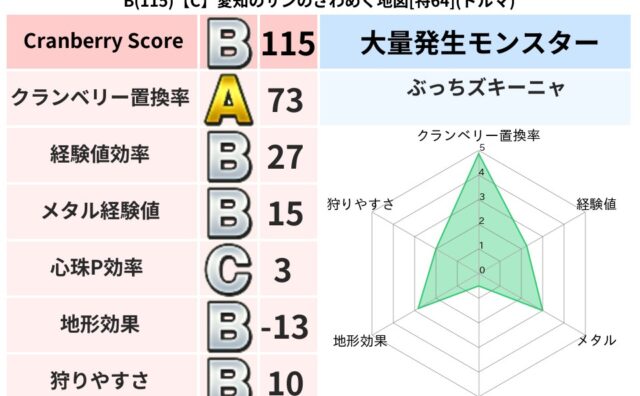 地図判定結果 B(130)【C】愛知のサンのざわめく地図[特64](ドルマ) クランベリーボット判定結果の詳細クランベリースコア:130クランベリー置換率:73%大量発生モンスター:ぶっちズキーニャドルマ超耐性(11%)系統狩り(47%)こころ道 完全一致モンスターヘルボックル: 魔剣士(魔道Lv30)ストーンマン:... 2024/12/02 21:22 地図判定結果