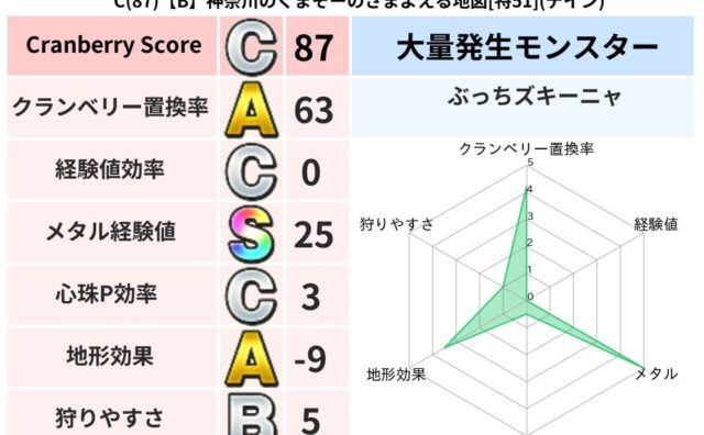地図判定結果 B(139)【B】栃木のアーサーのざわめく地図[特70](バギ) クランベリーボット判定結果の詳細クランベリースコア:139クランベリー置換率:46%大量発生モンスター:ぶっちズキーニャバギ超耐性(0%) 2024/12/20 22:17 地図判定結果
