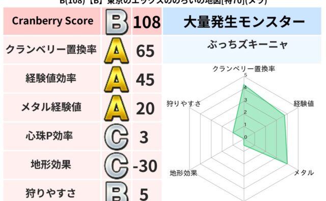 地図判定結果 B(108)【B】東京のエックスののろいの地図[特70](メラ) クランベリーボット判定結果の詳細クランベリースコア:108クランベリー置換率:65%大量発生モンスター:ぶっちズキーニャメラ超耐性(80%)超耐性・弱耐性なし:イオこころ道 完全一致モンスターキメラ大魔導士(共通Lv1)デビルアーマー大神官... 2025/01/21 10:09 地図判定結果