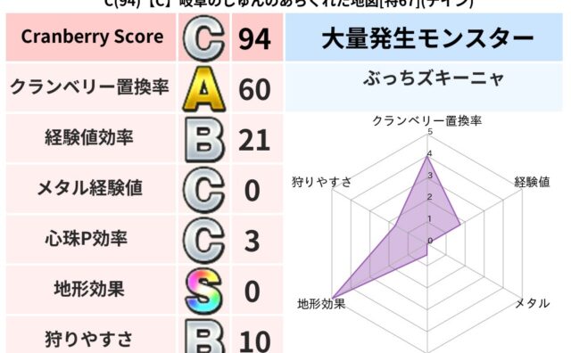 クランベリーボット判定結果の詳細クランベリースコア86クランベリー置換率65%大量発生モンスターぶっちズキーニャ超耐性ヒャド(22%)超耐性・弱耐性なしジバリアこころ道 完全一致モンスターデビルアーマー大神官(舞道Lv5)リカントマムルドラ...