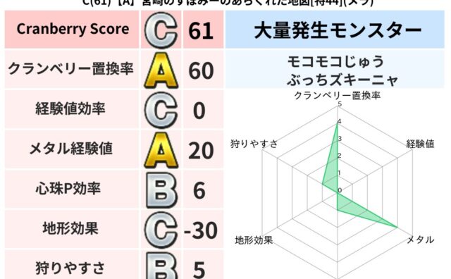 地図判定結果 C(61)【A】宮崎のすぼみーのあらくれた地図[特44](メラ) クランベリーボット判定結果の詳細クランベリースコア:61クランベリー置換率:60%大量発生モンスター:モコモコじゅう,ぶっちズキーニャメラ超耐性(48%)こころ道 完全一致モンスターねこまどうニンジャ(風道Lv5)ストーンマンゴッドハンド(... 2024/10/13 18:06 地図判定結果
