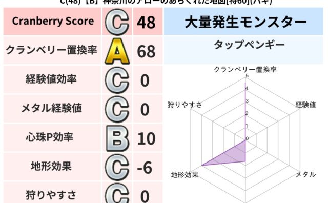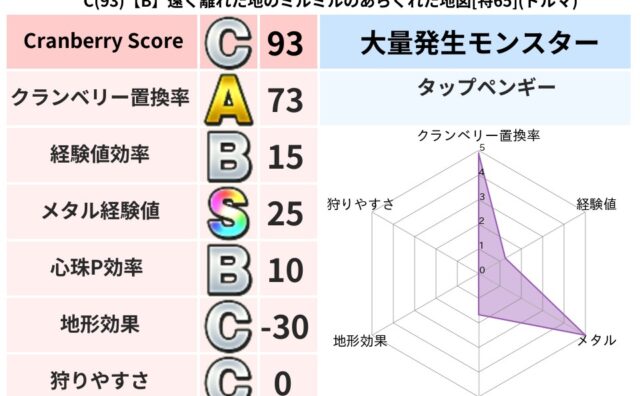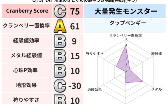 クランベリーボット判定結果の詳細クランベリースコア121クランベリー置換率78%大量発生モンスタータップペンギー超耐性バギ(6%)こころ道 完全一致モンスターどくろあらいゴッドハンド(守護道Lv5)しのどれいゴッドハンド(守護道Lv5)大魔...
