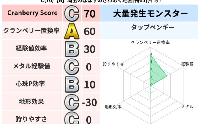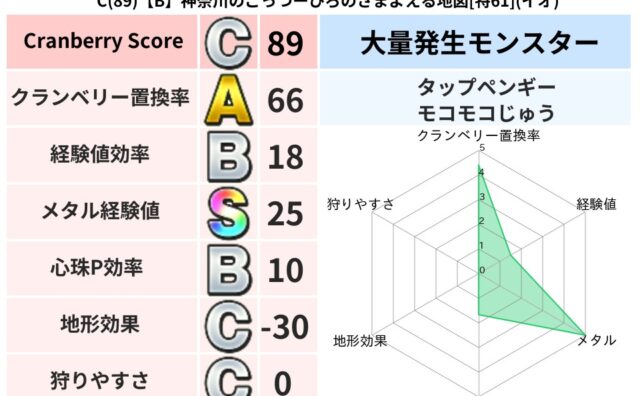 クランベリーボット判定結果の詳細クランベリースコア55クランベリー置換率60%大量発生モンスタータップペンギー超耐性イオ(72%)こころ道 完全一致モンスターどくイモムシニンジャ(波道Lv5)かっちゅうアリ魔人(共通Lv1)イエティ魔剣士(...
