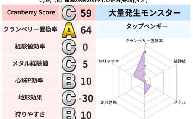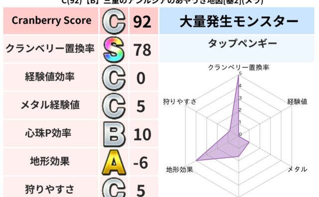 クランベリーボット判定結果の詳細クランベリースコア:91クランベリー置換率:76%大量発生モンスター:タップペンギーデイン超耐性(0%)こころ道 完全一致モンスターリカントマムル: ドラゴン(竜道Lv5)デビルアーマー: 大神官(舞道Lv5...
