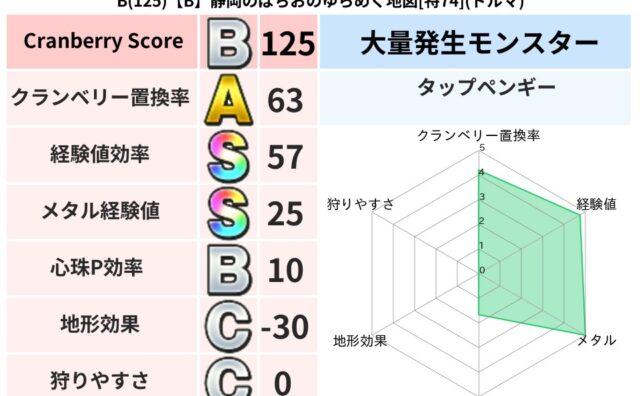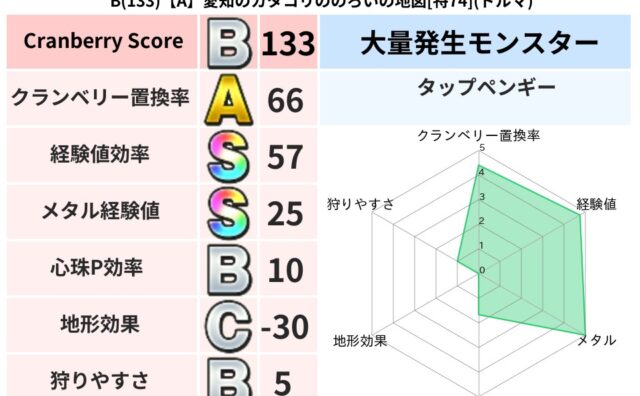 クランベリーボット判定結果の詳細クランベリースコア:128クランベリー置換率:63%大量発生モンスター:タップペンギーギラ超耐性(51%)こころ道 完全一致モンスターフレイム守り人(ささえ道Lv5)リカントマムルドラゴン(竜道Lv5)どろに...