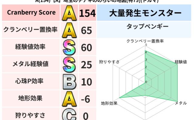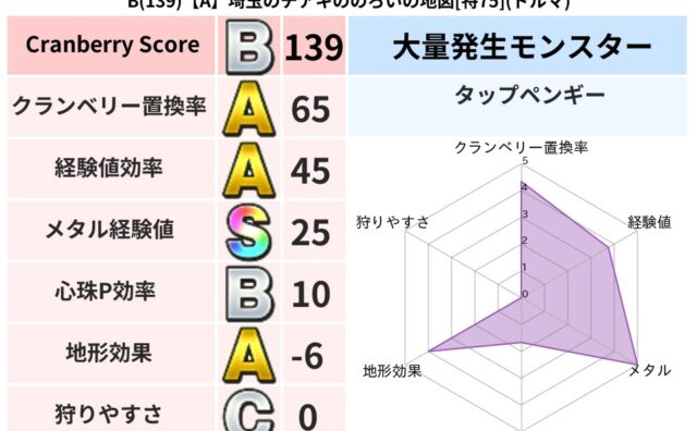 クランベリーボット判定結果の詳細クランベリースコア:141クランベリー置換率:66%大量発生モンスター:タップペンギーデイン超耐性(44%)系統狩り(41%)こころ道 完全一致モンスターくさった死体ゴッドハンド(守護道Lv5),大魔導士(魔...