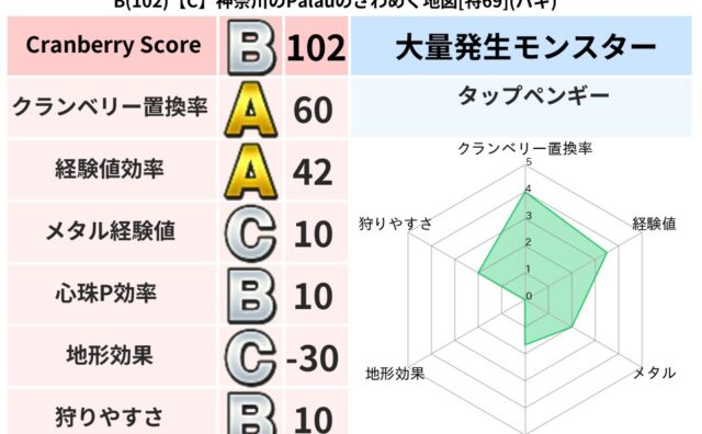 クランベリーボット判定結果の詳細クランベリースコア:133クランベリー置換率:46%大量発生モンスター:タップペンギージバリア超耐性(1%)系統狩り(41%)こころ道 完全一致モンスターみならいあくま: ニンジャ(風道Lv5)ギズモ: 天地...