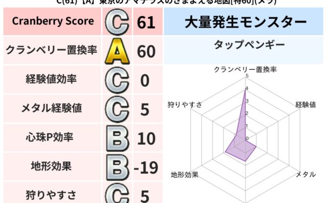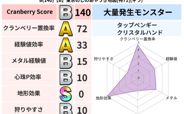 クランベリーボット判定結果の詳細クランベリースコア140クランベリー置換率72%大量発生モンスタータップペンギー,クリスタルハンド超耐性ギラ(0%)こころ道 完全一致モンスターどくどくゾンビ魔剣士(共通Lv1)デビルアーマー大神官(舞道Lv...