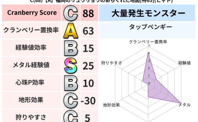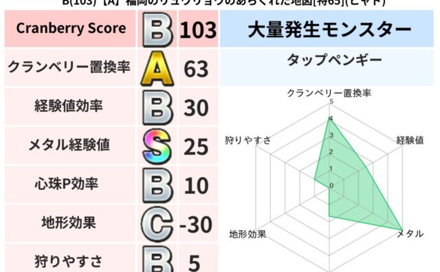 クランベリーボット判定結果の詳細クランベリースコア87クランベリー置換率76%大量発生モンスタータップペンギー超耐性イオ(91%)超耐性・弱耐性なしバギデインドルマこころ道 完全一致モンスターフレイム守り人(ささえ道Lv5)おおさそりゴッド...