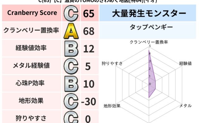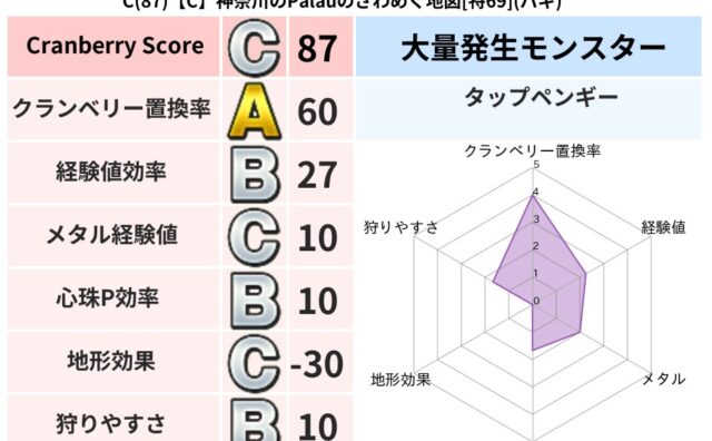 クランベリーボット判定結果の詳細クランベリースコア:133クランベリー置換率:46%大量発生モンスター:タップペンギージバリア超耐性(1%)系統狩り(41%)こころ道 完全一致モンスターみならいあくま: ニンジャ(風道Lv5)ギズモ: 天地...