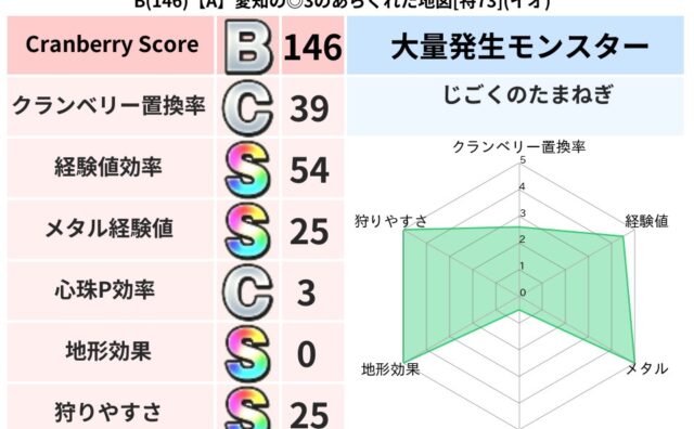 クランベリーボット判定結果の詳細クランベリースコア:146クランベリー置換率:39%大量発生モンスター:じごくのたまねぎイオ超耐性(0%)超耐性・弱耐性なし:デインこころ道 完全一致モンスターブラウニー: 守り人(共通Lv1)ストーンマン:...