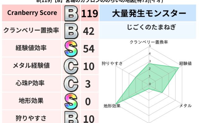 クランベリーボット判定結果の詳細クランベリースコア:146クランベリー置換率:39%大量発生モンスター:じごくのたまねぎイオ超耐性(0%)超耐性・弱耐性なし:デインこころ道 完全一致モンスターブラウニー: 守り人(共通Lv1)ストーンマン:...