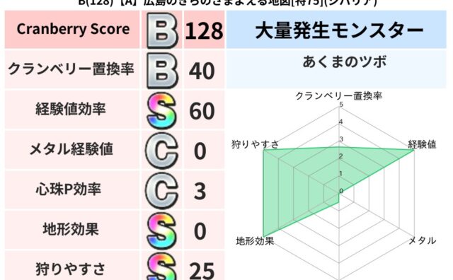 クランベリーボット判定結果の詳細クランベリースコア:128クランベリー置換率:40%大量発生モンスター:あくまのツボジバリア超耐性(0%)超耐性・弱耐性なし:ドルマ系統狩り(50%)こころ道 完全一致モンスターしりょうのきし: 大神官(舞道...