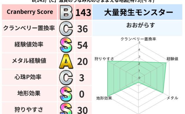 地図判定結果 B(143)【C】滋賀のうなみんのさまよえる地図[特73](イオ) クランベリーボット判定結果の詳細クランベリースコア:143クランベリー置換率:36%大量発生モンスター:おおがらすイオ超耐性(0%)系統狩り(41%)こころ道 完全一致モンスターさまようよろい: ゴッドハンド(守護道Lv5)ストーンマン: ... 2025/09/15 00:36 地図判定結果