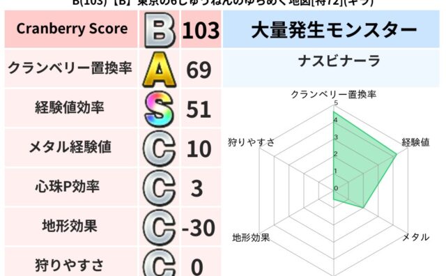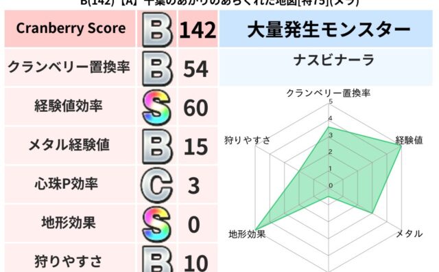 地図判定結果 B(142)【A】千葉のあかりのあらくれた地図[特75](メラ) クランベリーボット判定結果の詳細クランベリースコア:142クランベリー置換率:54%大量発生モンスター:ナスビナーラメラ超耐性(0%)こころ道 完全一致モンスタードロヌーバ: ニンジャ(波道Lv5)ブラウニー: 守り人(共通Lv1)パペット... 2025/09/21 21:32 地図判定結果