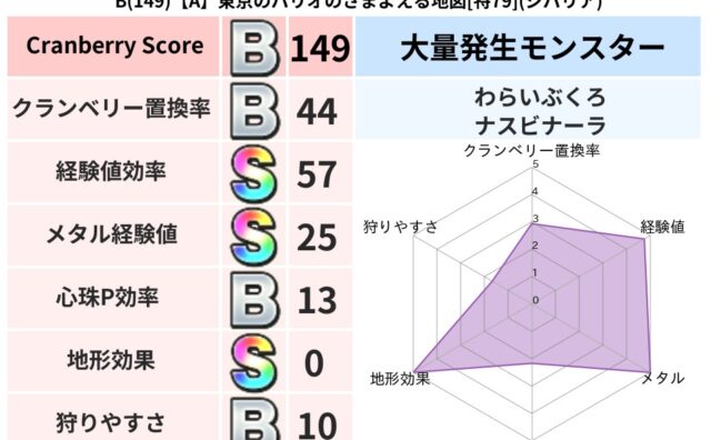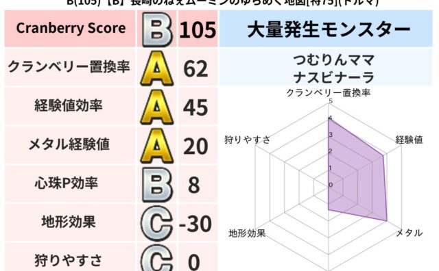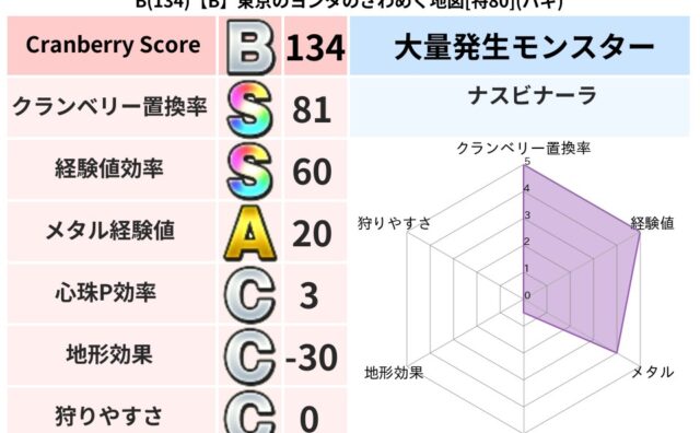 クランベリーボット判定結果の詳細クランベリースコア90クランベリー置換率65%大量発生モンスターナスビナーラ超耐性ヒャド(58%)こころ道 完全一致モンスタースカルガルードラゴン(竜道Lv5)ヘルボックル魔剣士(魔道Lv30)どくどくゾンビ...