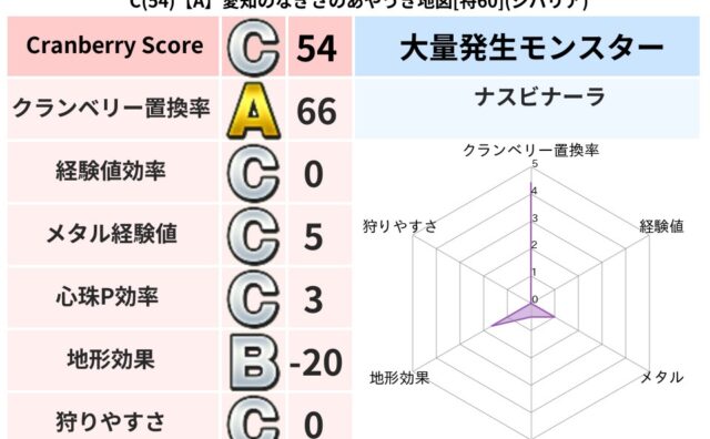 クランベリーボット判定結果の詳細クランベリースコア54クランベリー置換率66%大量発生モンスターナスビナーラ超耐性ジバリア(17%)こころ道 完全一致モンスターさまようよろいゴッドハンド(守護道Lv5)ストーンマンゴッドハンド(守護道Lv5...