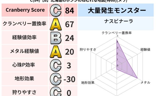 クランベリーボット判定結果の詳細クランベリースコア137クランベリー置換率66%大量発生モンスターナスビナーラ超耐性メラ(2%)こころ道 完全一致モンスターキースドラゴン大魔道士(理力道Lv5)しましまキャットニンジャ(共通Lv1)じんめん...
