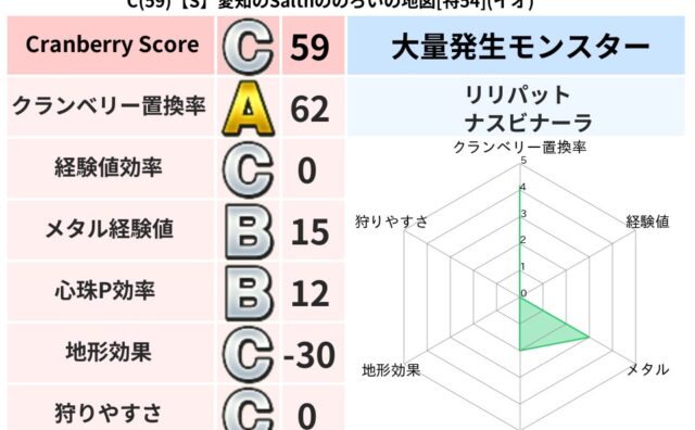 地図判定結果 C(59)【S】愛知のSaltnののろいの地図[特54](イオ) クランベリーボット判定結果の詳細クランベリースコア:59クランベリー置換率:62%大量発生モンスター:リリパット,ナスビナーライオ超耐性(44%)こころ道 完全一致モンスターねこまどうニンジャ(風道Lv5)マジカルハット大魔導士(魔力道Lv... 2024/02/05 10:33 地図判定結果